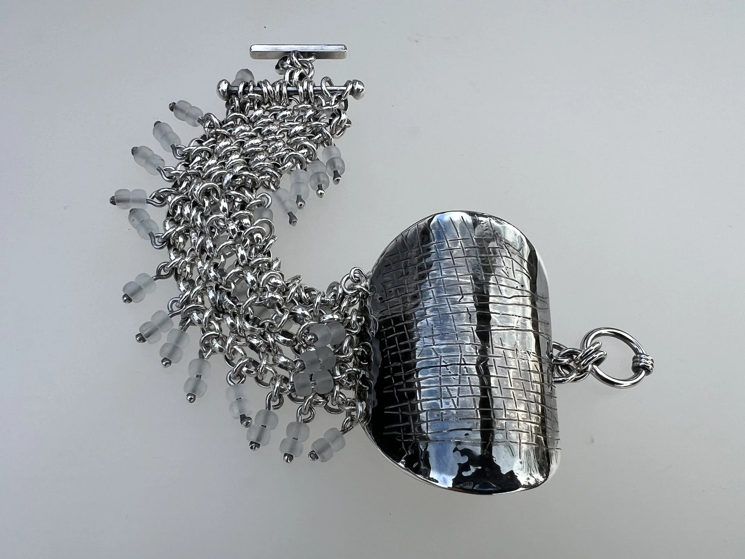 Jeg liker også å kombinere sølvet med steiner og ulike materialer. Steinene har en egen vibrasjon. I kombinasjonen sølv med materialer som stein, rav, glass, handelsperler, skapes det en dynamikk som gir smykkene en egen klang og helhet.